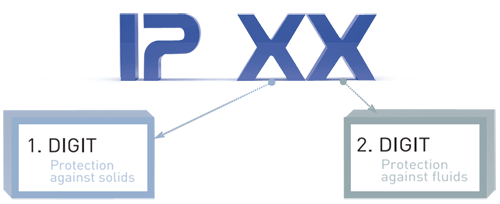 IP protection classes define protection levels of electric equipments against contact with solids and fluids, as mentioned in the internaitonal IEC 60529 standard. IP protection class of an equipment is specified with a two digits number as shown below: